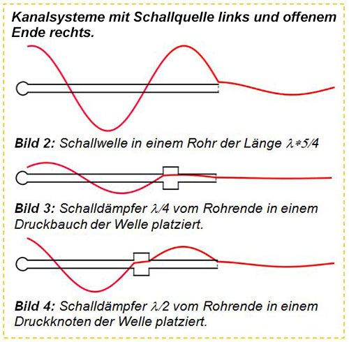 Mit einer entsprechenden Schallquelle bildet sich in diesem Rohr eine Resonanz aus, die Schall gut abstrahlt. Wird ein Schalldämpfer in den Druckbauch von der Mündung platziert (Bild 3), verändert sich das Schallfeld drastisch. Wird dagegen der Schalldämpfer in einem Druckknoten platziert