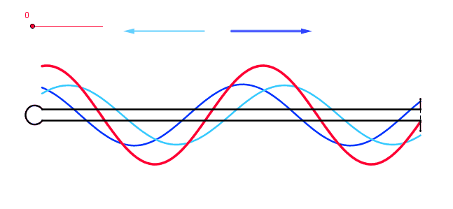 In einem akustisch engen Rohr läuft eine ebene Schallwelle von links nach rechts auf das Rohrende zu. Dort wird die Schallwelle reflektiert. Die Reflektion erfolgt mit umgekehrtem Vorzeichen und die reflektierte Schallwelle läuft nun von rechts nach links. Die Überlagerung von beiden ergibt eine stehende Welle (rot) in der Rohrleitung.